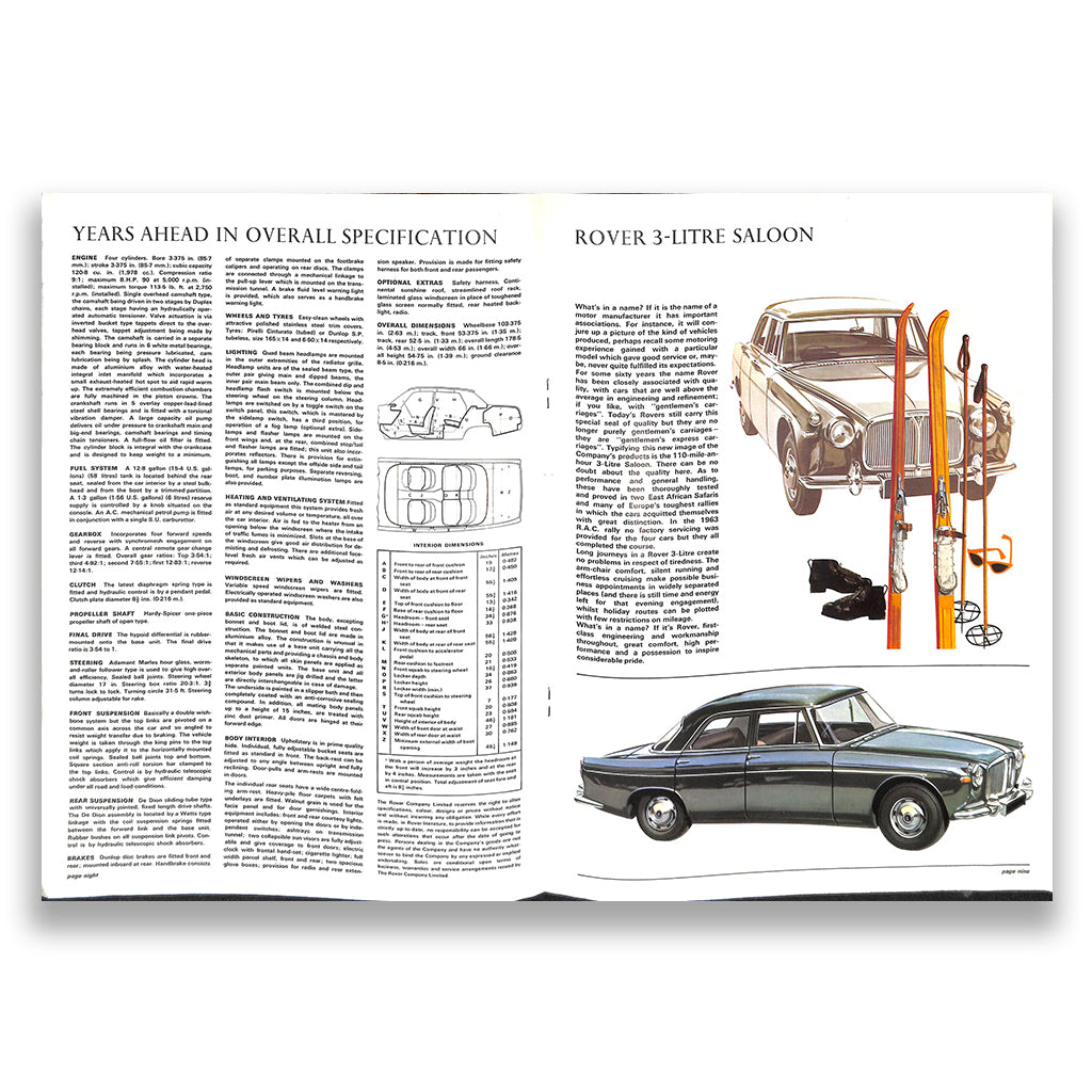 Rover UK Market Range brochure from 1965, featuring the Rover 2000 P6 Series, and the older P5 3-litre models in both Saloon and Coupe form. 16-page, full colour A4 brochure.